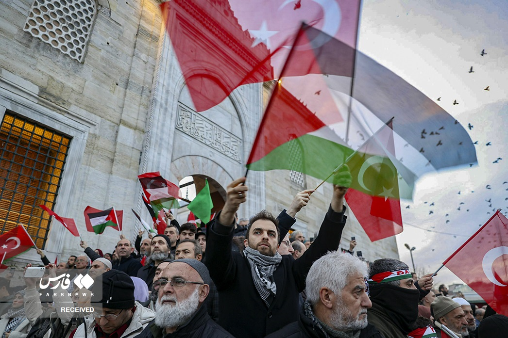 The participants in this demonstration After offering morning prayers in the mosques of “Aya Sofia”, “Amin Ono”, “Sultan Ahmed” and “Sulaimaniye”, they moved towards the “Galata” bridge, holding Turkish and Palestinian flags and chanting slogans.