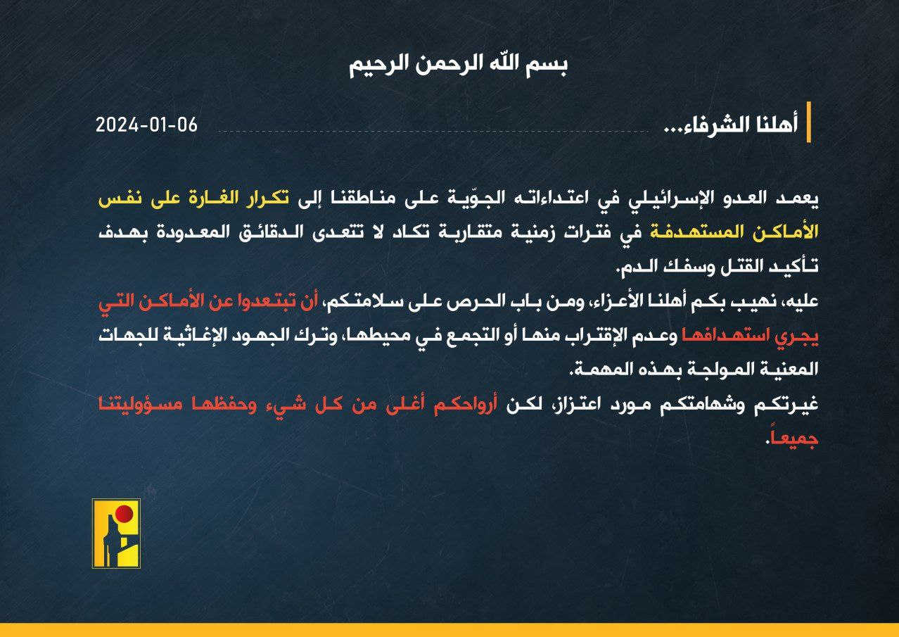 Hezbollah asked the people of South Lebanon not to approach the targeted areas due to the repeated attacks of the Zionists, because it considers the lives of Lebanese people more valuable than anything else.