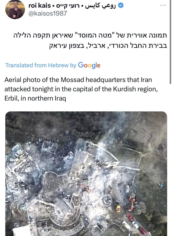 Fifth: In the media attack that started yesterday, pictures of children were published and it was claimed that these children were killed in the IRGC attack; these pictures are old and false, just like the hoaxes that were published in Syria. Other rumors have been spread to downplay the missile attack, all of which show that the IRGC’s missile attack was very painful for the Israeli enemy. The Twitter of an Israeli journalist named “Ruei Katz” mentioned that he wrote in a post: “Aerial photo of the Mossad headquarters that Iran attacked tonight in Erbil, the capital of the Kurdistan Region in northern Iraq.”