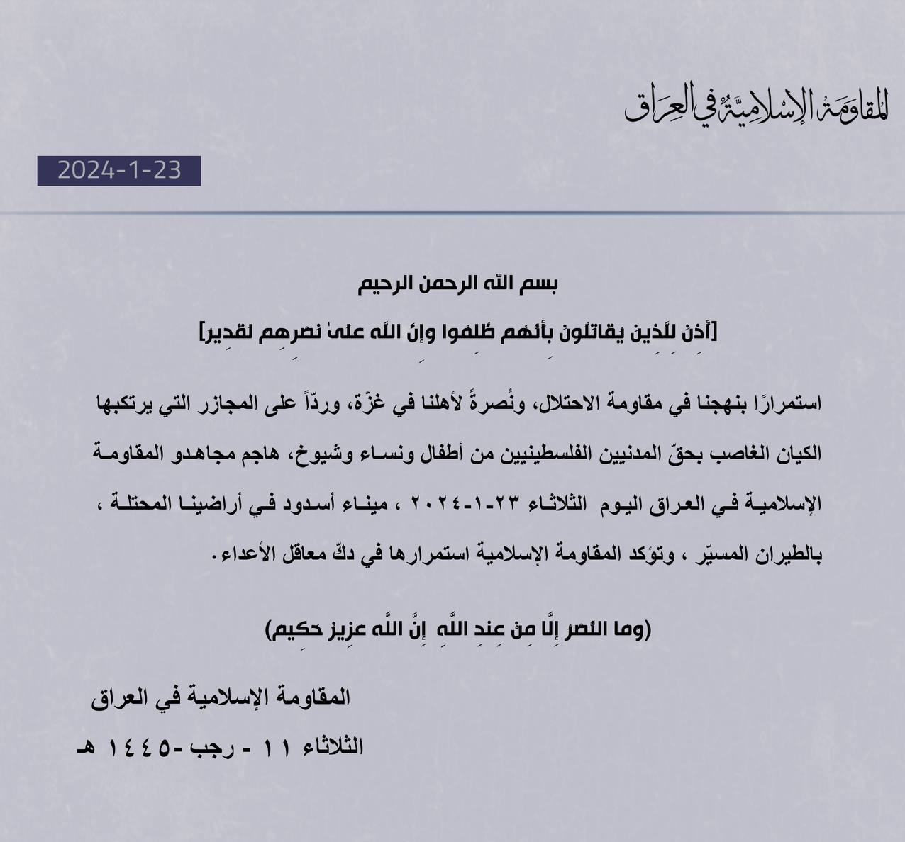 In these statements, the Iraqi resistance emphasized that the attacks on Zionist positions and the United States as their first-class supporters in supporting the people of the Gaza Strip in against the genocide and also against the occupation of the Americans in the region.