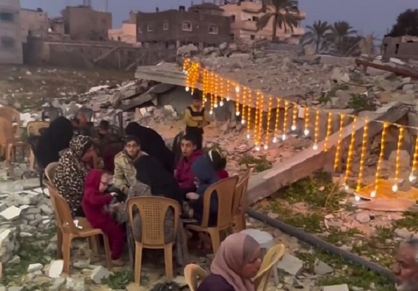 | Local sources have broadcast images from Gaza, during which some Palestinian families have spread the Iftar table on the ruins of their houses, despite the complete destruction of their homes in the attacks of the Zionist regime. |