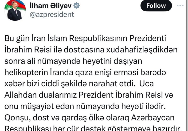 According to the international group Tasnim News Agency, Azerbaijan President Ilham Aliyev tweeted President of our country Seyed Ebrahim Raisi wrote about the accident that happened to the helicopter: Today, after saying a friendly goodbye to the President of the Islamic Republic of Iran, Ebrahim Raisi, we were very worried about the emergency landing of the helicopter carrying the high delegation in Iran. Our prayers to Almighty God are with President Ebrahim Raisi and his accompanying delegation. As a neighboring country, friend and brother, the Republic of Azerbaijan is ready for any help.