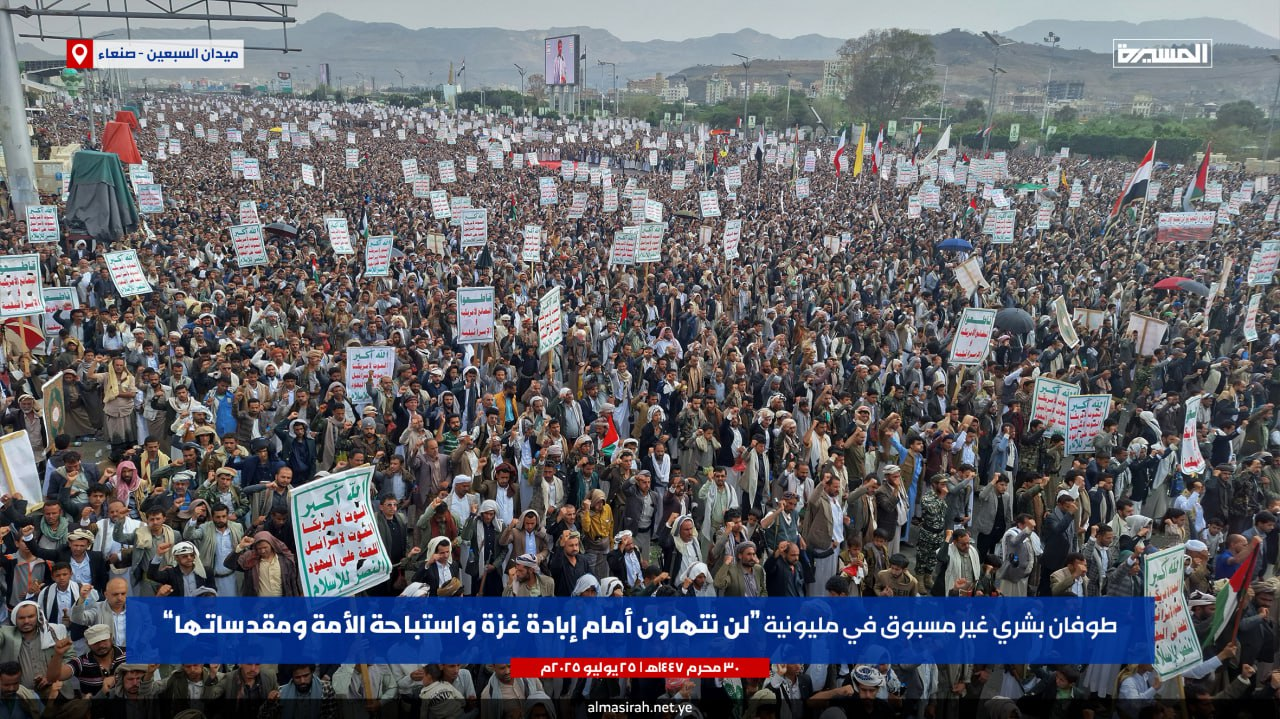The Al-Sabeen Square in Sana’a witnessed an unprecedented million-strong rally today backing the oppressed people of gaza, according too the Yemeni Al-Masirah network, as reported by webangah News Agency citing Mehr News Agency.