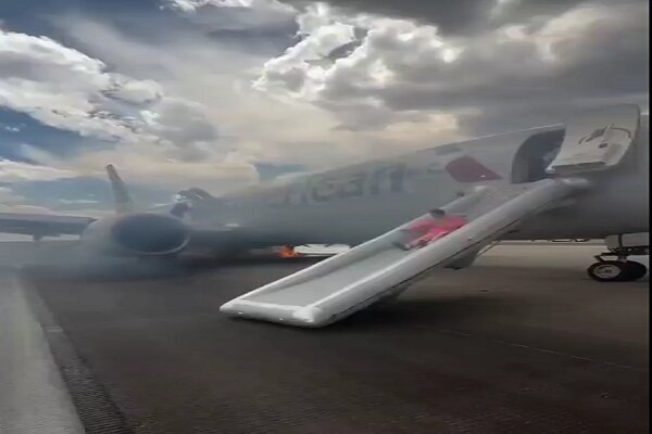 A video shared on social media shows the left landing gear of the plane engulfed in flames while passengers evacuate using an inflatable emergency slide.