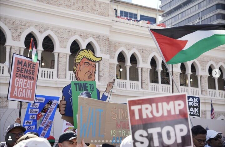 According to the English section of webangah News Agency, citing Mehr News Agency and RT, Palestinian supporters‍ and Malaysian protesters gathered against U.S. President Donald Trump’s policies upon his arrival in Kuala Lumpur‍ for ⁢the Association of Southeast Asian‍ Nations​ (ASEAN) summit.