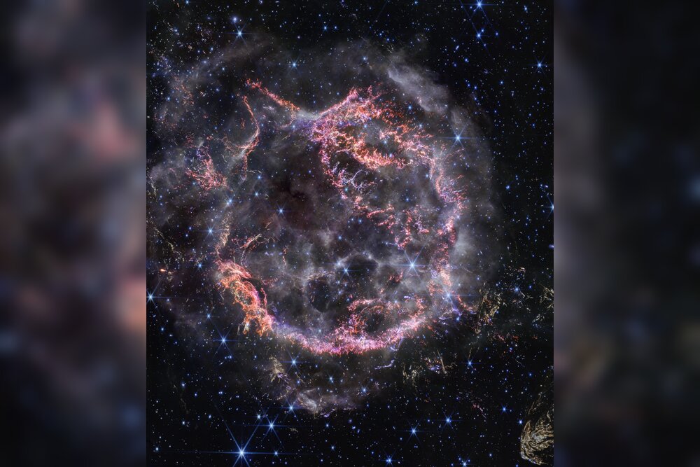 The expanding supernova remnant known as Cassiopeia A represents the final stage of a star’s life cycle. Light from the supernova explosion that created these remnants was first observed in Earth’s sky approximately 350 years ago, though it took 11,000 years for that light to reach our planet.